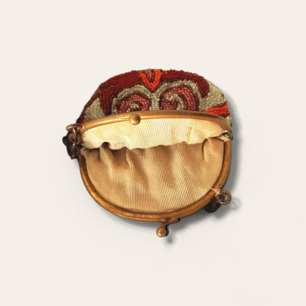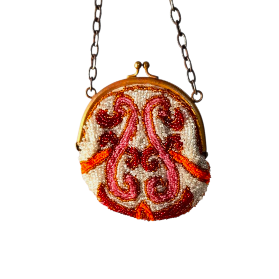Antique 1930s art nouveau microbeaded purse. Decorated with stunning grey, pink, red and vibrant orange glass beads.