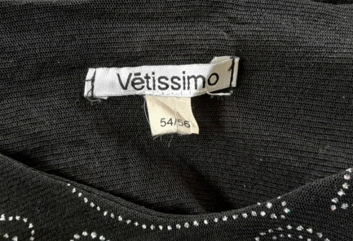 Vintage 90s Vetissimo top. Made from black stretchy net material decorated with pretty tiny white gems in a paisley design. The gems have the prettiest rainbow twinkle when they catch the light ; so hard capture in picture. The sleeves are quarter length with a scoop neck and is plain black net at the back.