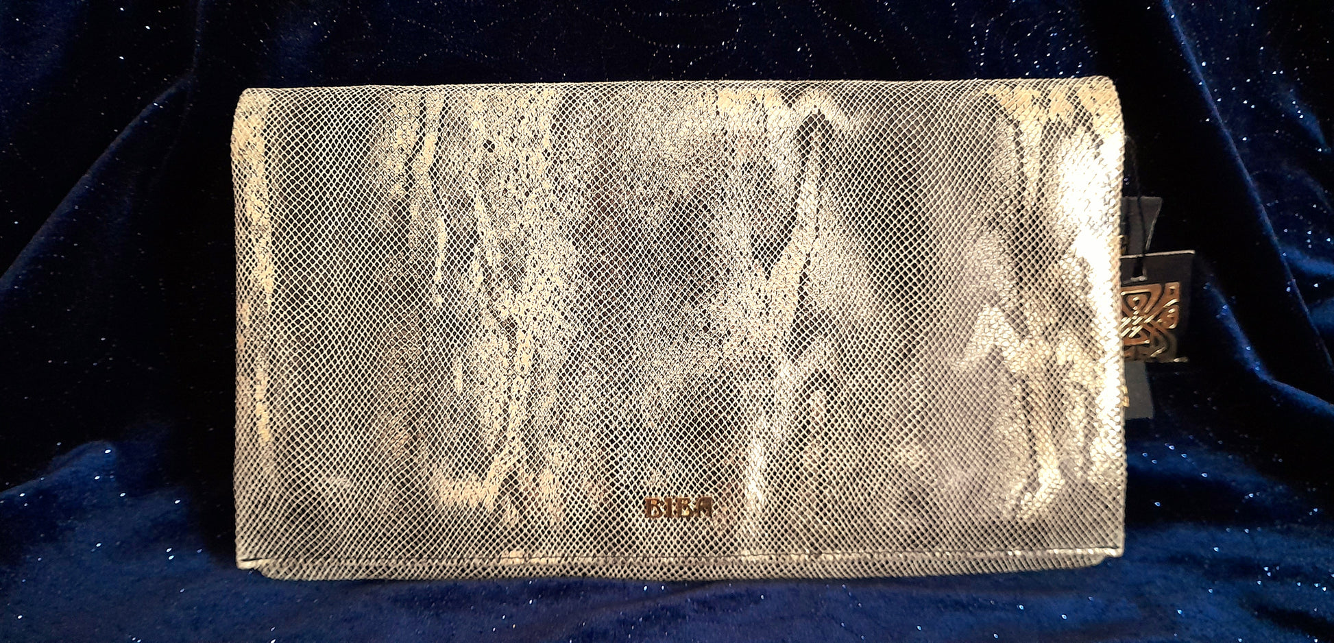 Stunning BIBA clutch bag. In pale gold shimmer snake skin print with gold hardware.