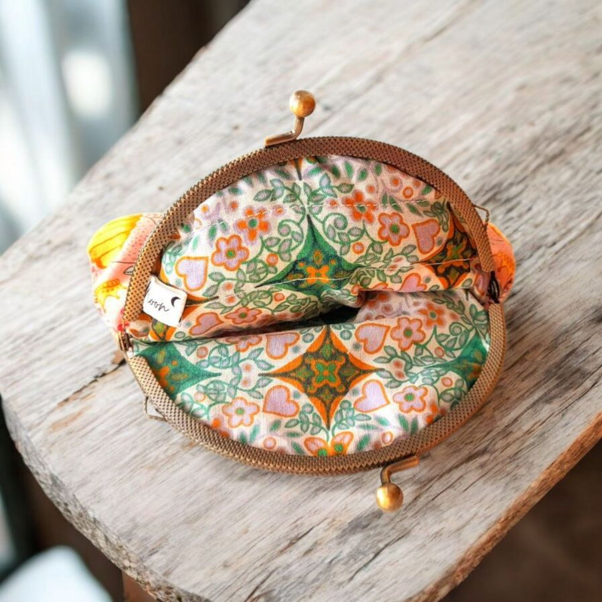 Inside is lined in white, green and orange tile and pink heart print vintage cotton with panels stuffed with real dried lavender so you get a lovely scent every time you open it!