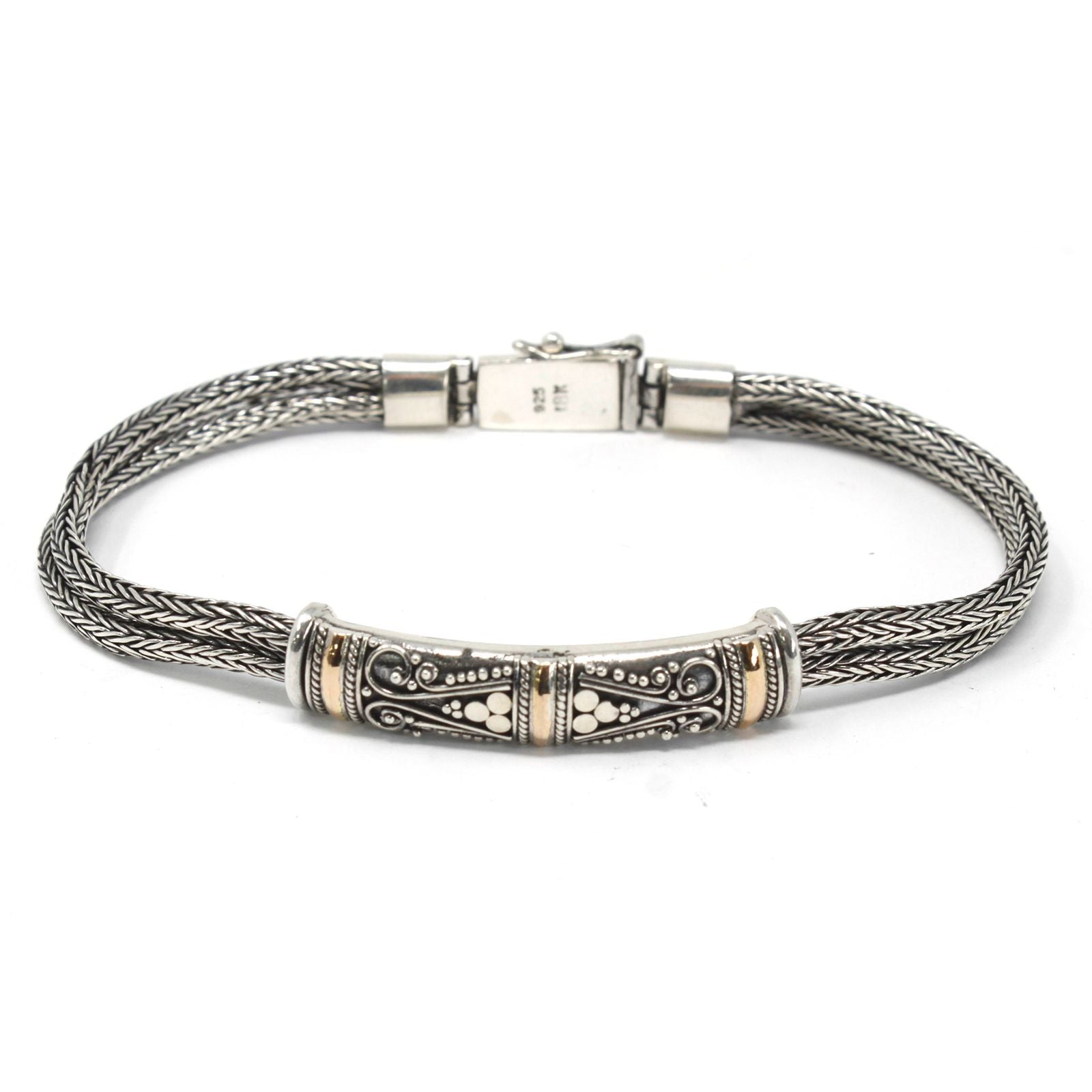 Stunning intricately decorated double chain bracelet ethically handcrafted in Indonesia with recycled gold and silver.