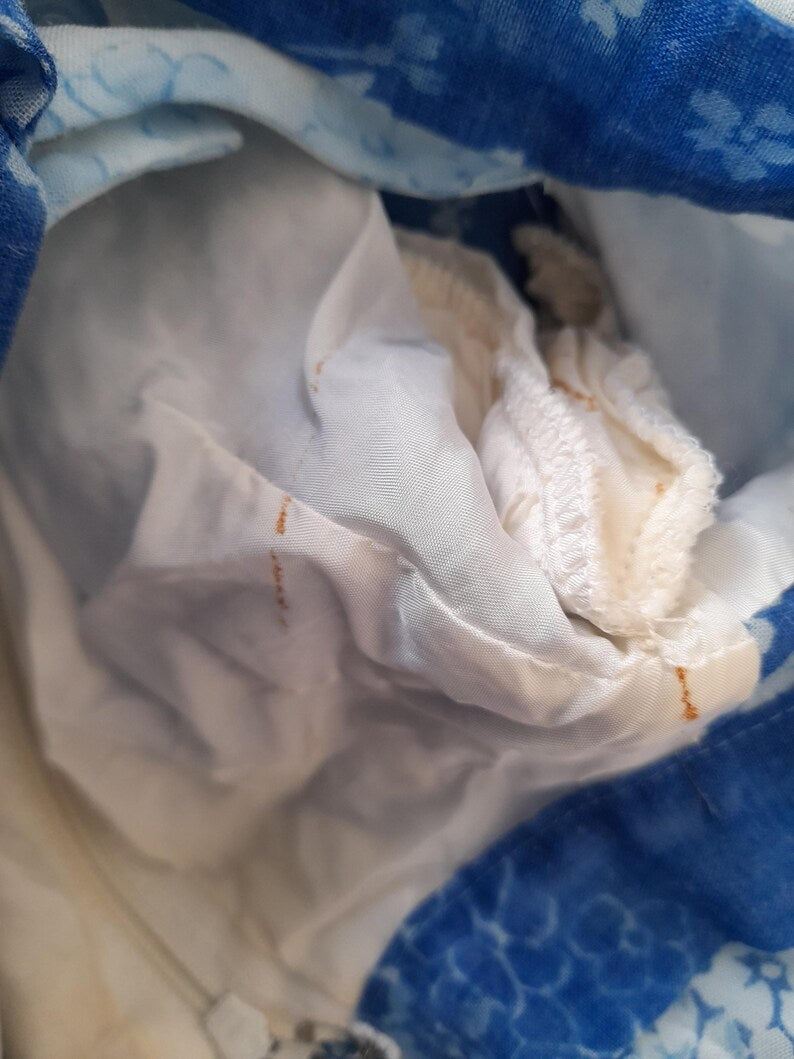 Lined in white silky material with a small shoulder pads & white zip & hook eye fastening at the back.