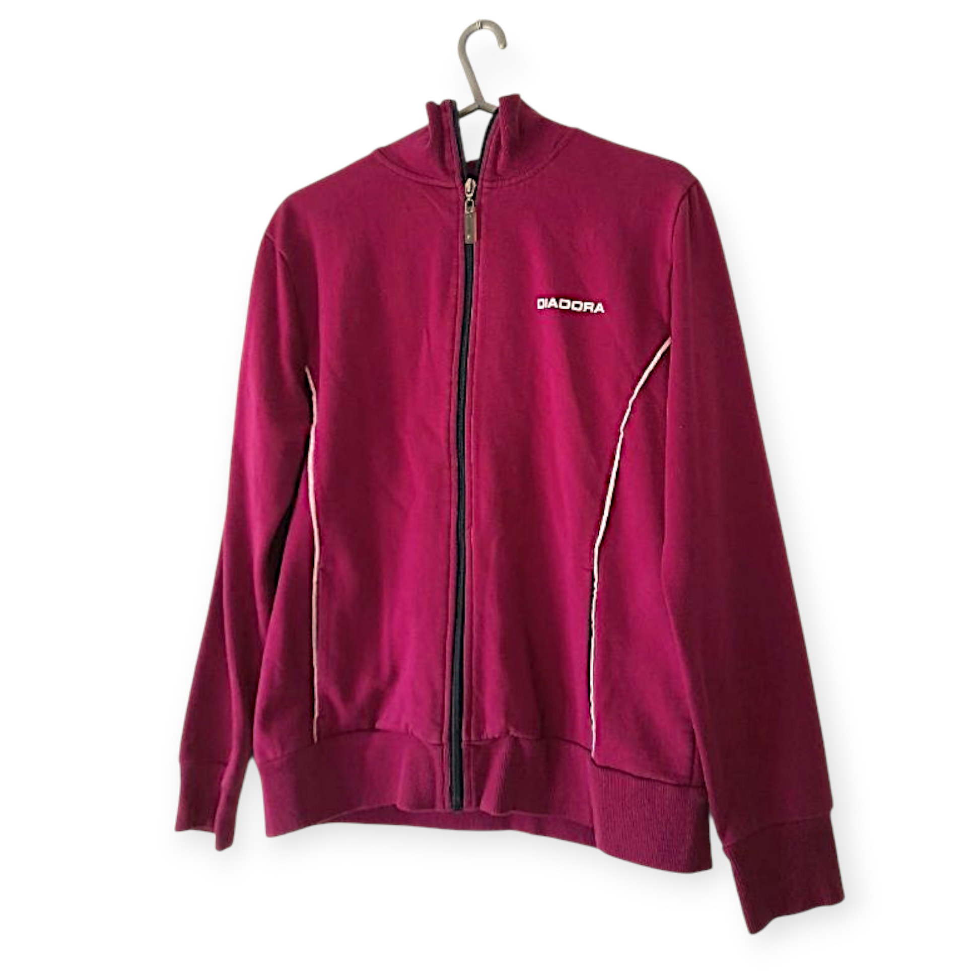 Diadora vintage 90s zip jacket. Made from dark pink polycotton with soft fleece lining and white pipe detailing.
