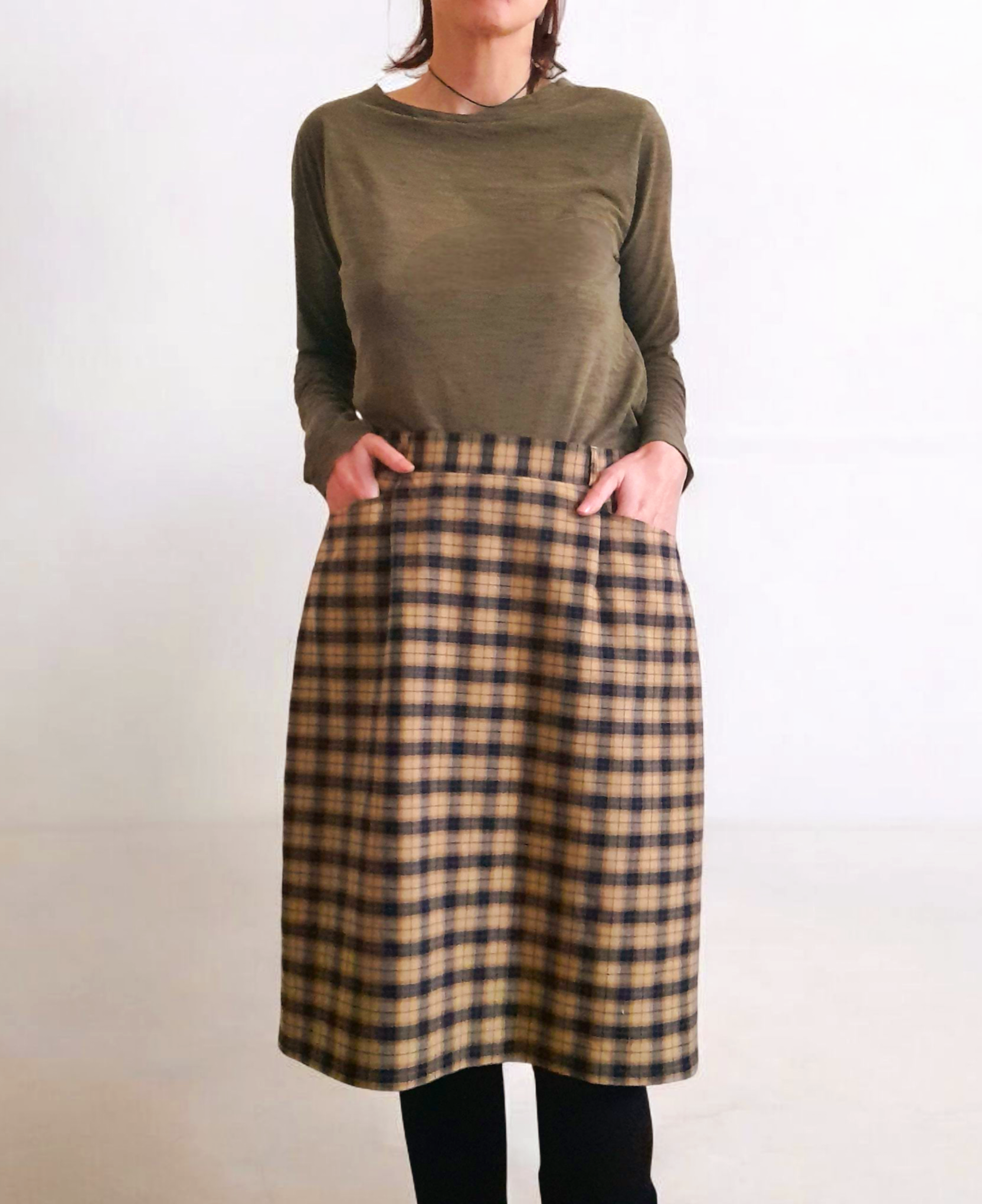 Vintage 90s Bianca wool blend skirt. Tan brown with an eye catching black checked plaid.