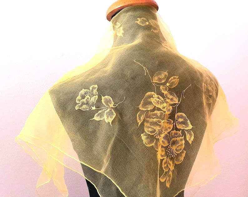 Vintage 1950s Retro Yellow Sheer Chiffon Floral Print Square Scarf