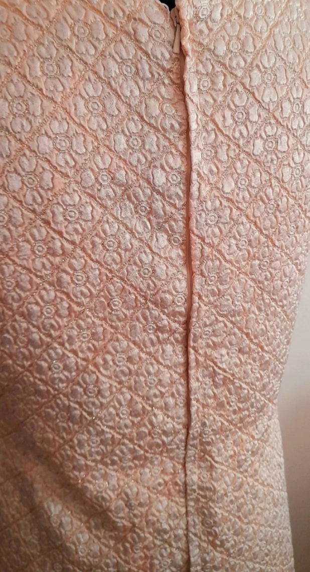 Vintage 1960s Evelyn Kleider flared mini dress. Made from silky pale cream satin with squares of quilted flowers outlined in metallic gold thread that has a gorgeous sparkle.