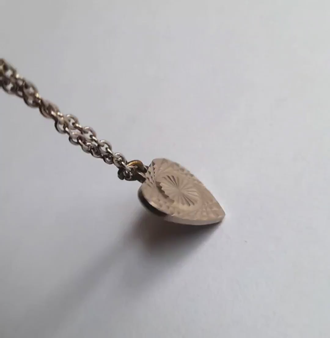 Hangs from a silver link chain and secures with a spring ring catch.