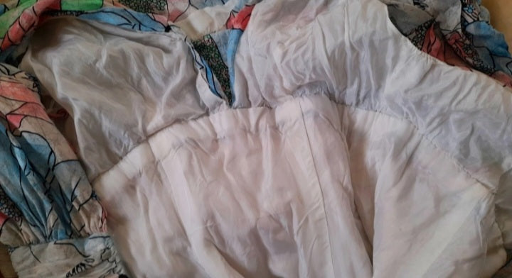 Fabulous vintage 80s dress. Made from silky white material printed with large pastel pink, blue and mint green flowers.