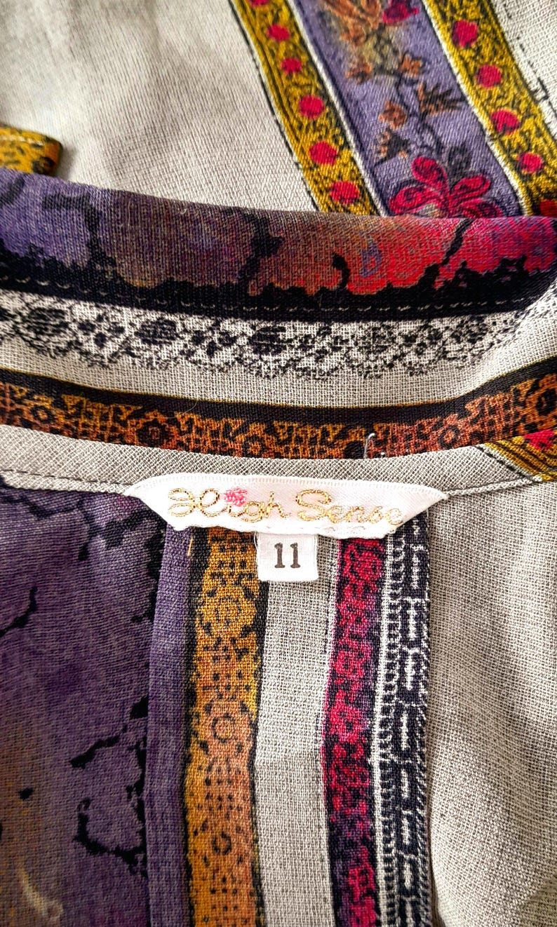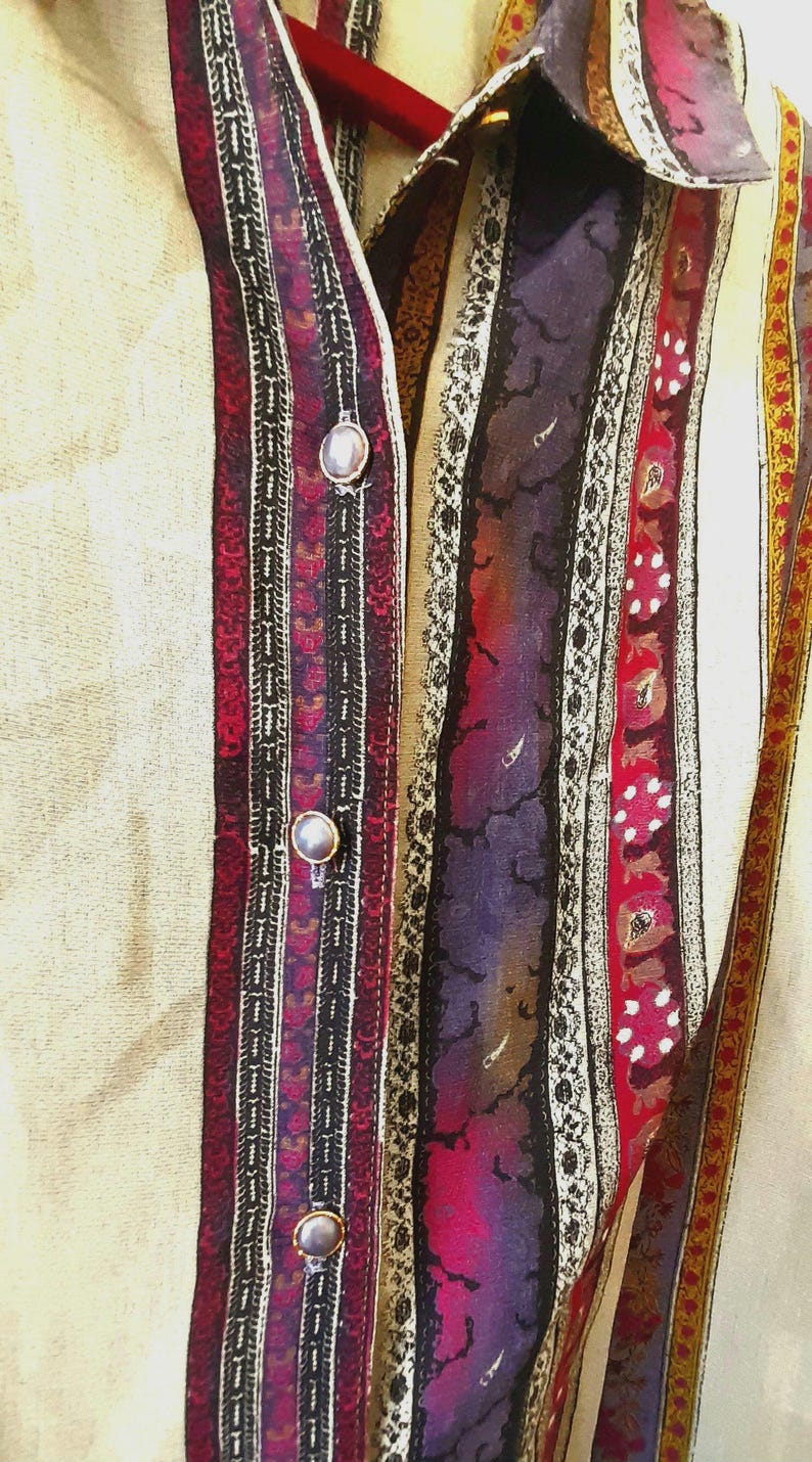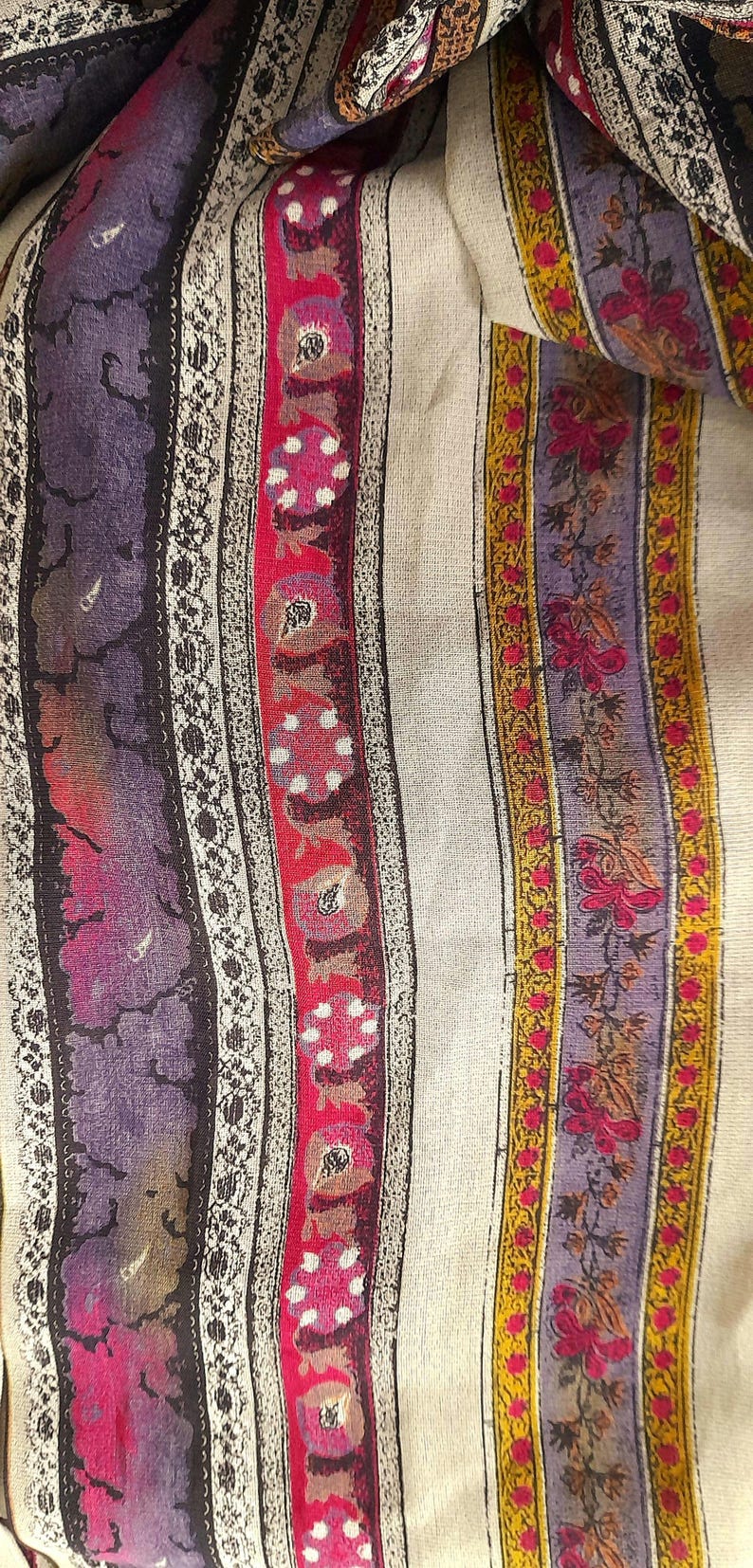 Made from semi-sheer chiffon material printed with a stunning sage green, purple and pink Ethnic flower stripe pattern.