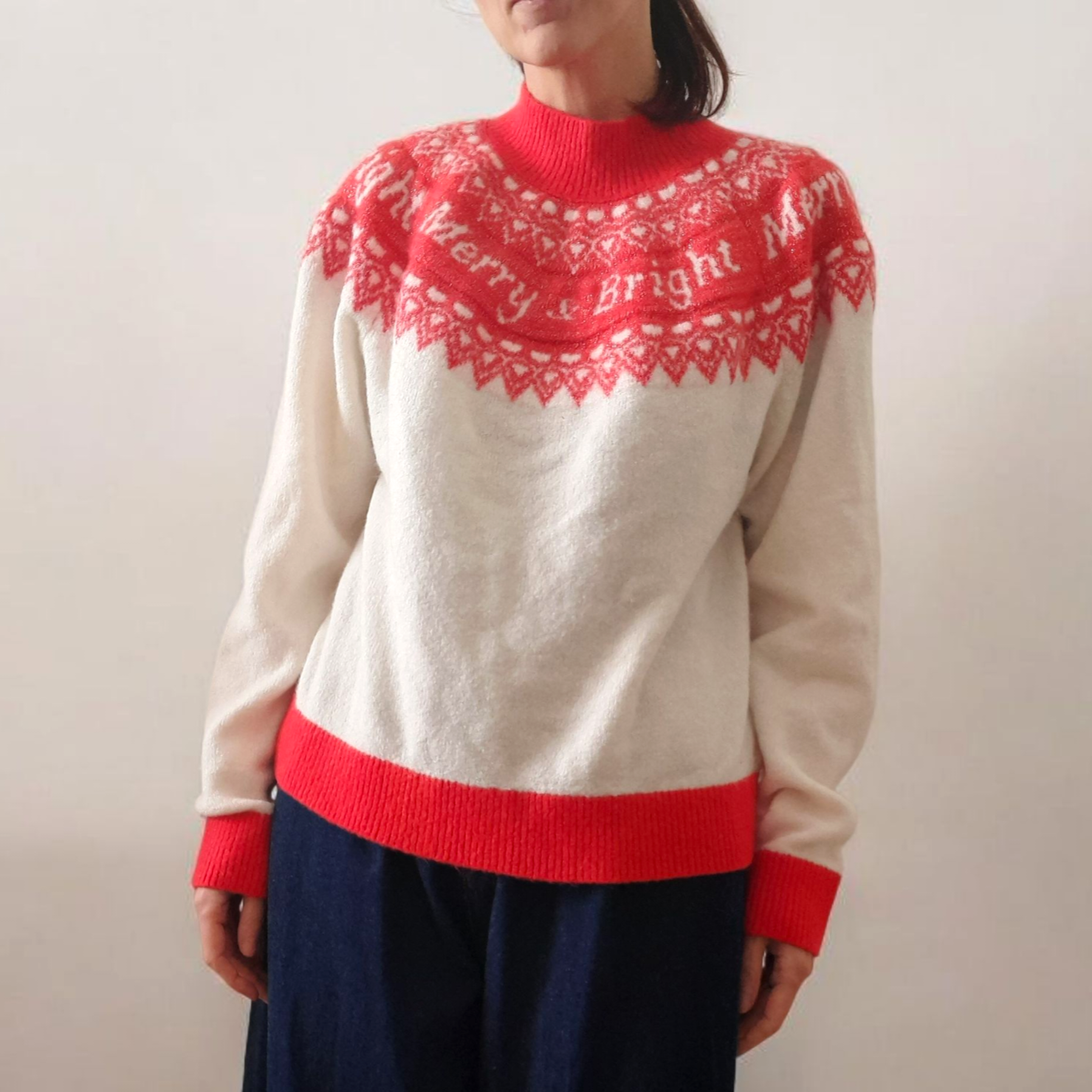Vintage 90s cute retro Holiday Time festive jumper. Knitted with super soft & stretchy cream yarn with a fab red & gold sparkly 'Merry & Bright' Fairisle pattern.