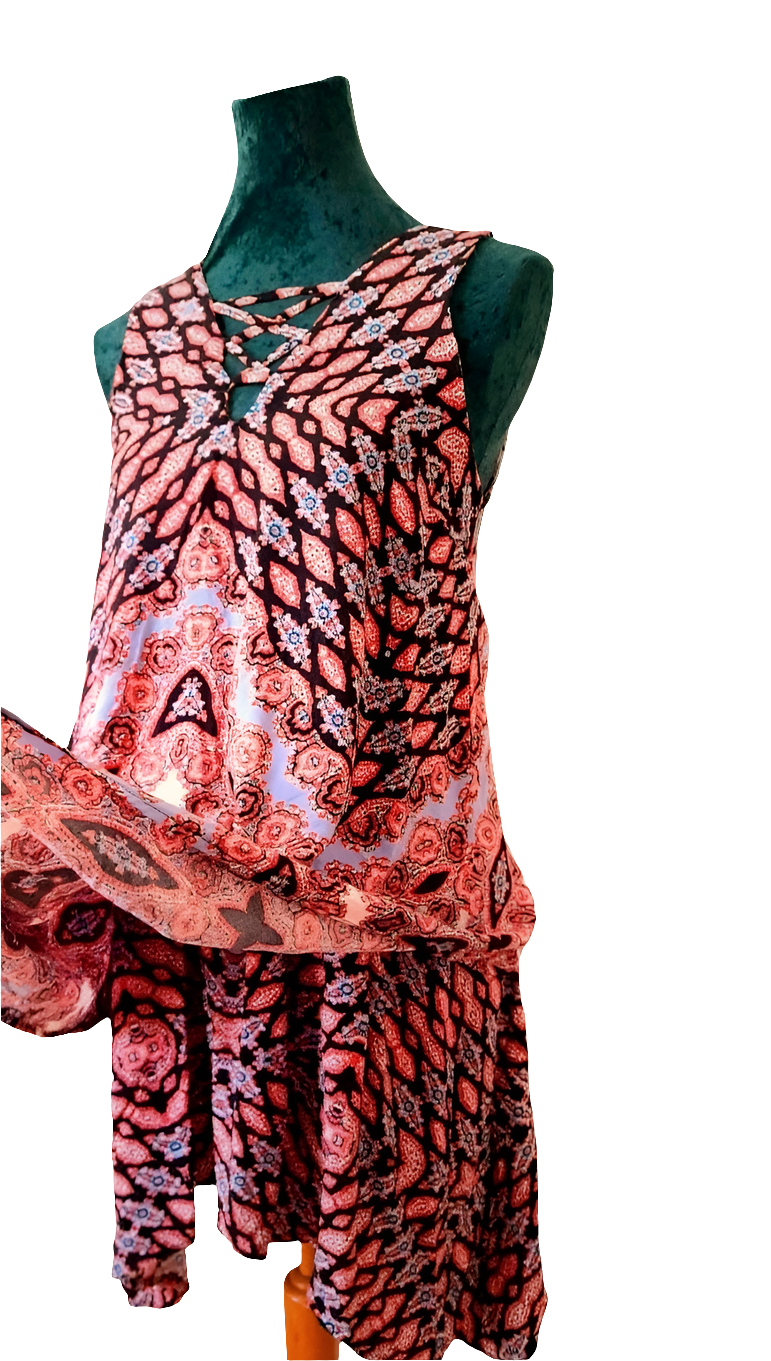 Trapeze shift style made from cool soft stretchy black viscose material printed with a stunning red and cornflower blue ethnic print.