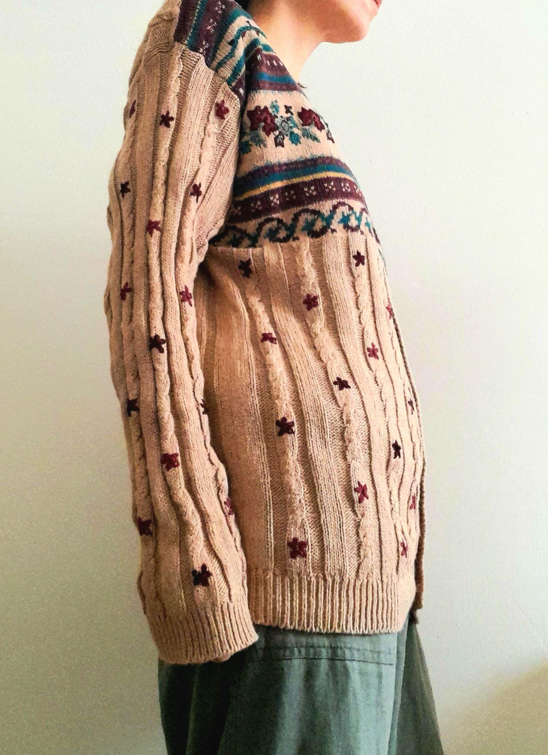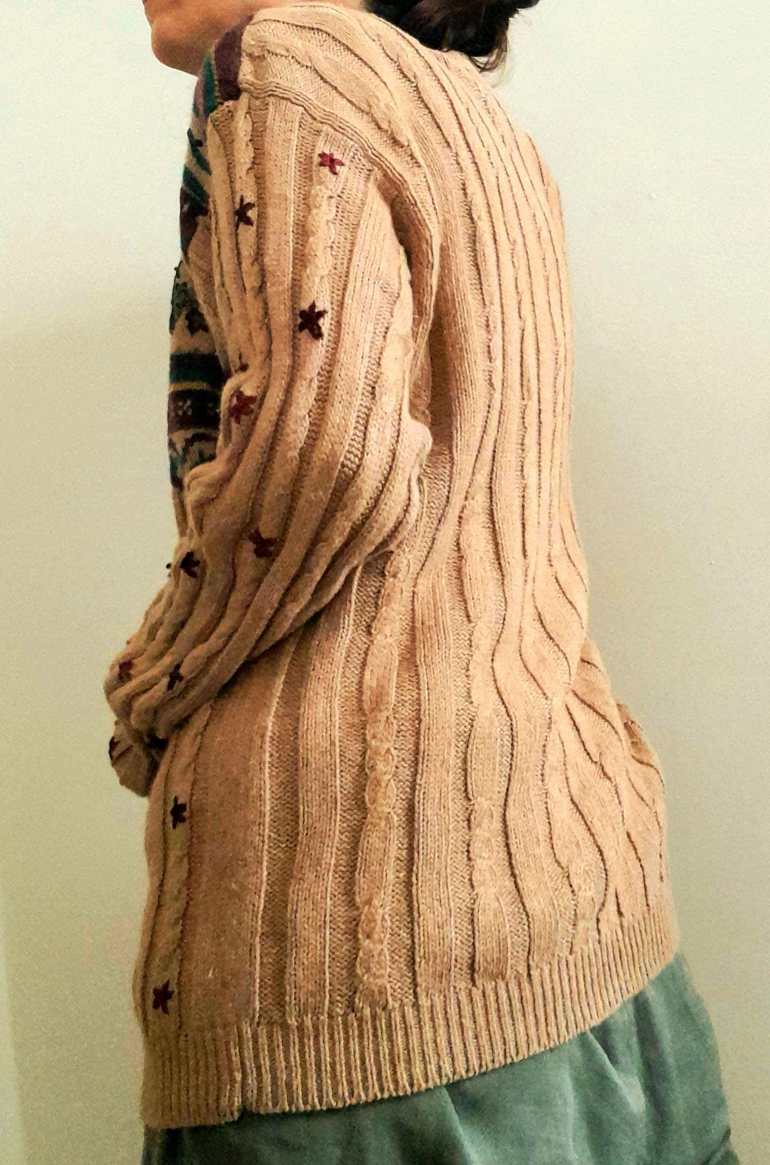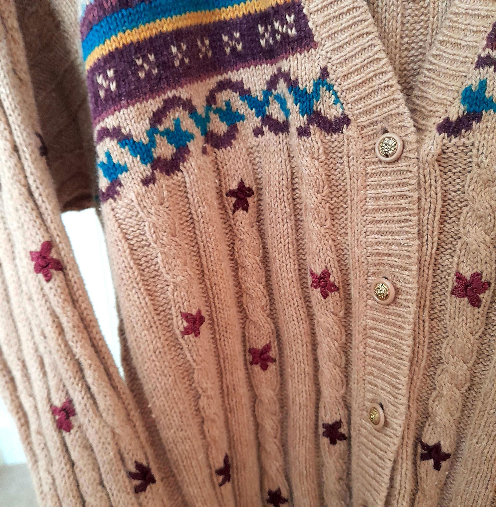 Vintage 90s cable rib knit cardigan. In light brown soft stretchy yarn with beautiful hand embroidered burgundy and dark green leaves and flowers at the front and down the arms.