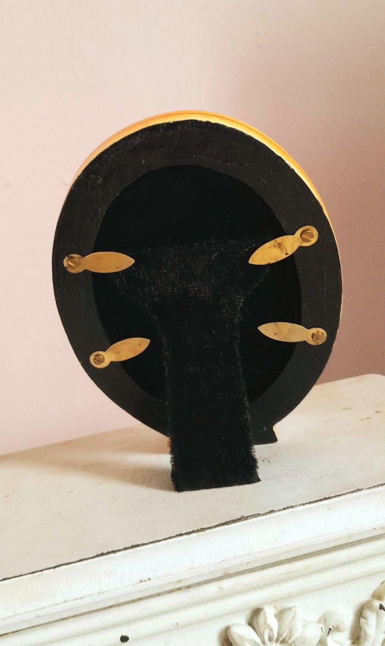 Vintage Indian Kashmir small oval picture frame. Made of laquered wood and handpainted with beautiful gold, pink and green ornate birds and flowers.