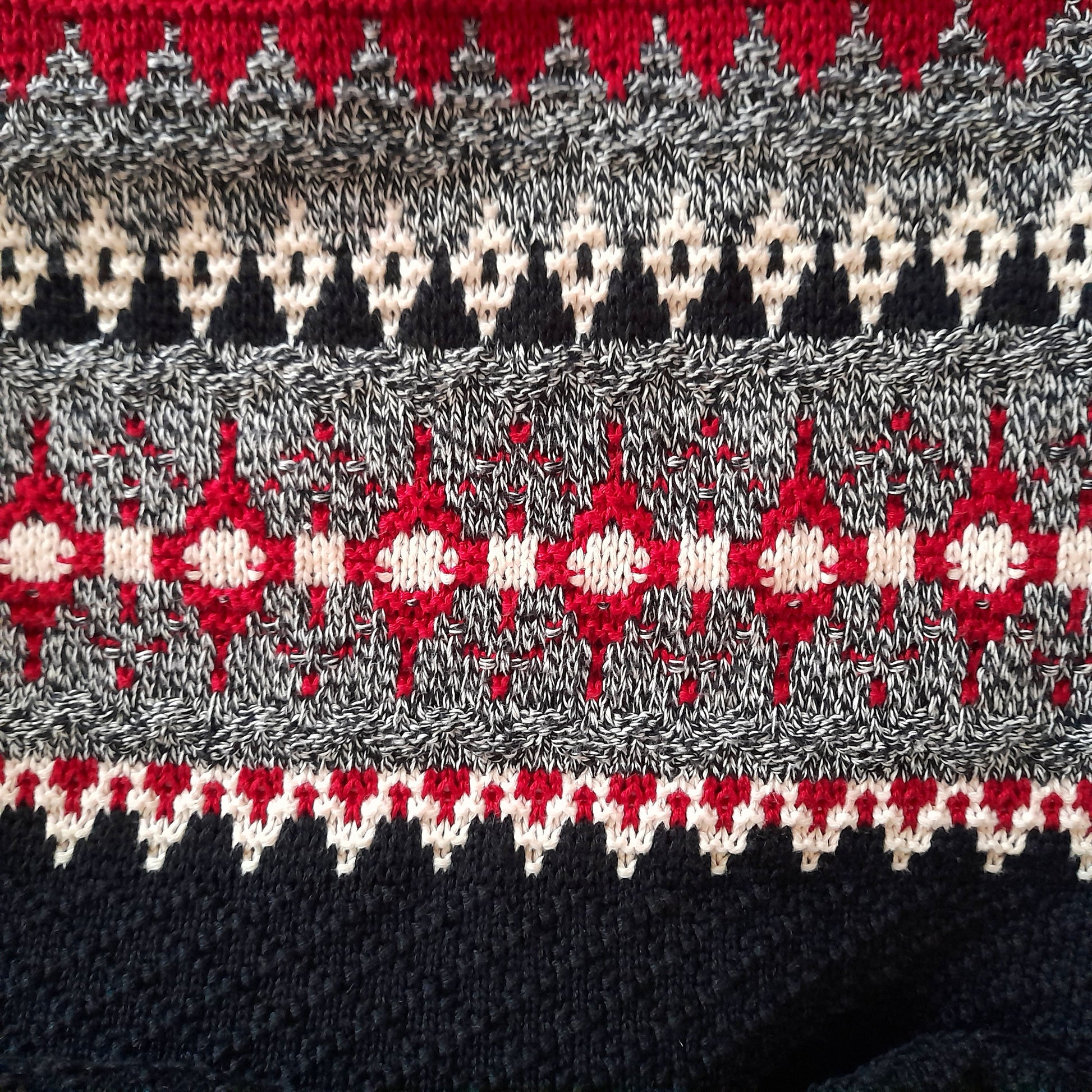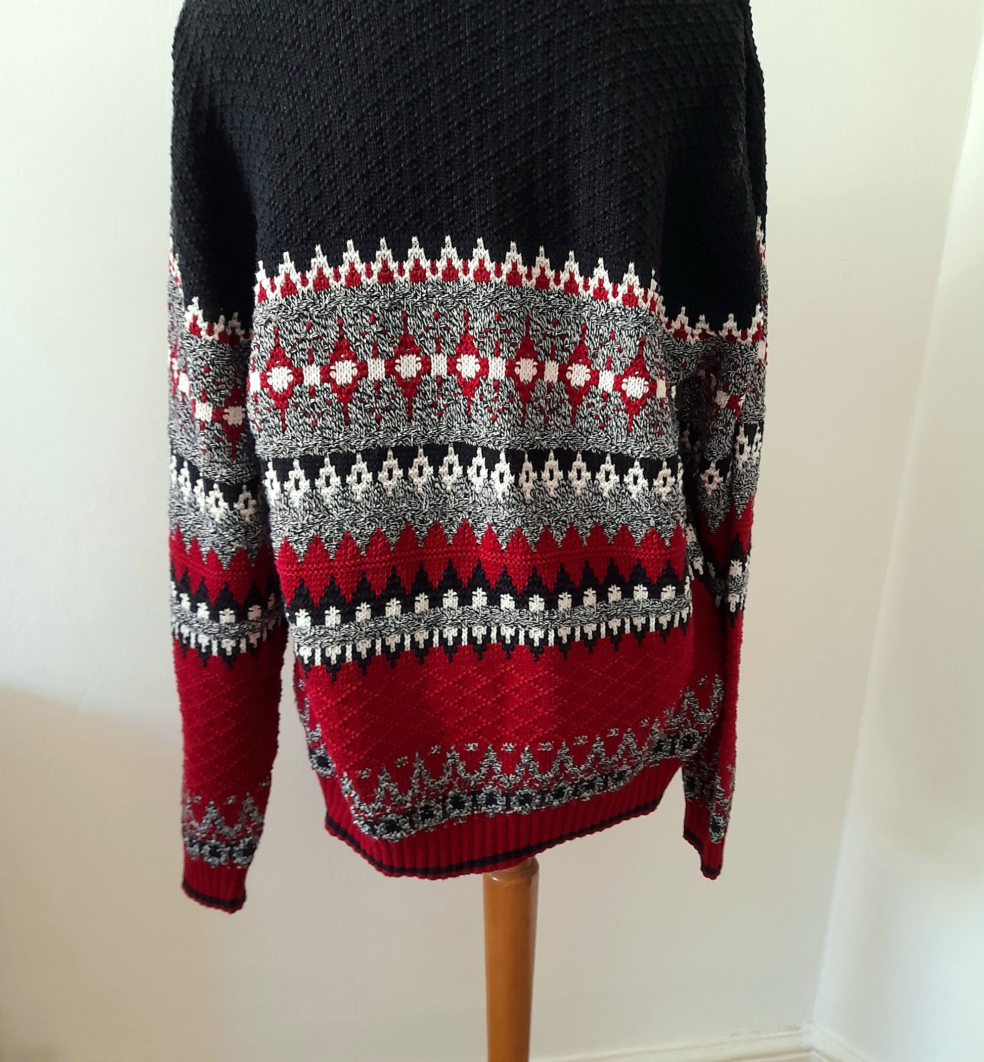 Knitted in soft red and black yarn in an amazing vibrant red eye-catching geometric diamond design. Has a relaxed fit with ribbed collar, hem and cuffs.