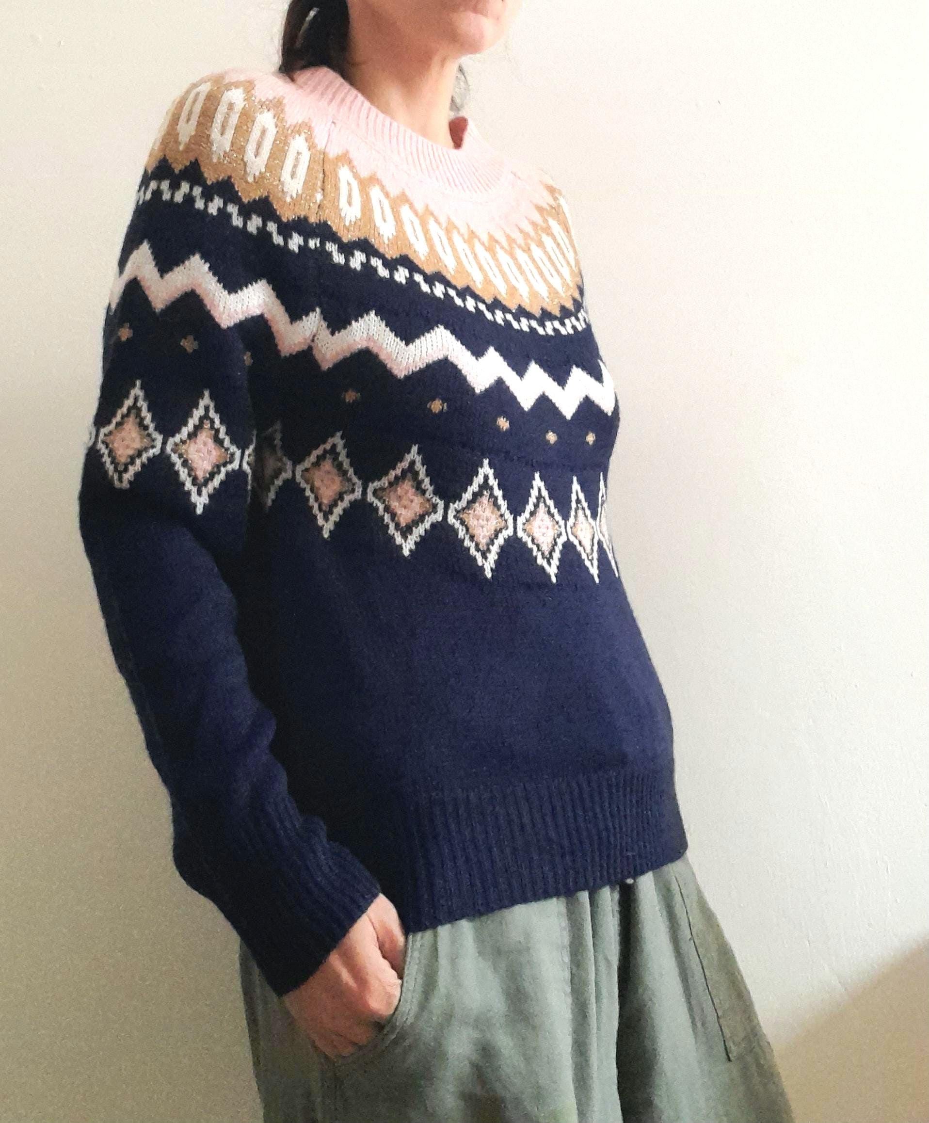 Vintage Y2K Crown & Ivy jumper. Knitted in soft navy yarn with a lovely eye-catching light pink, white and gold sparkly Fairisle geometric pattern.