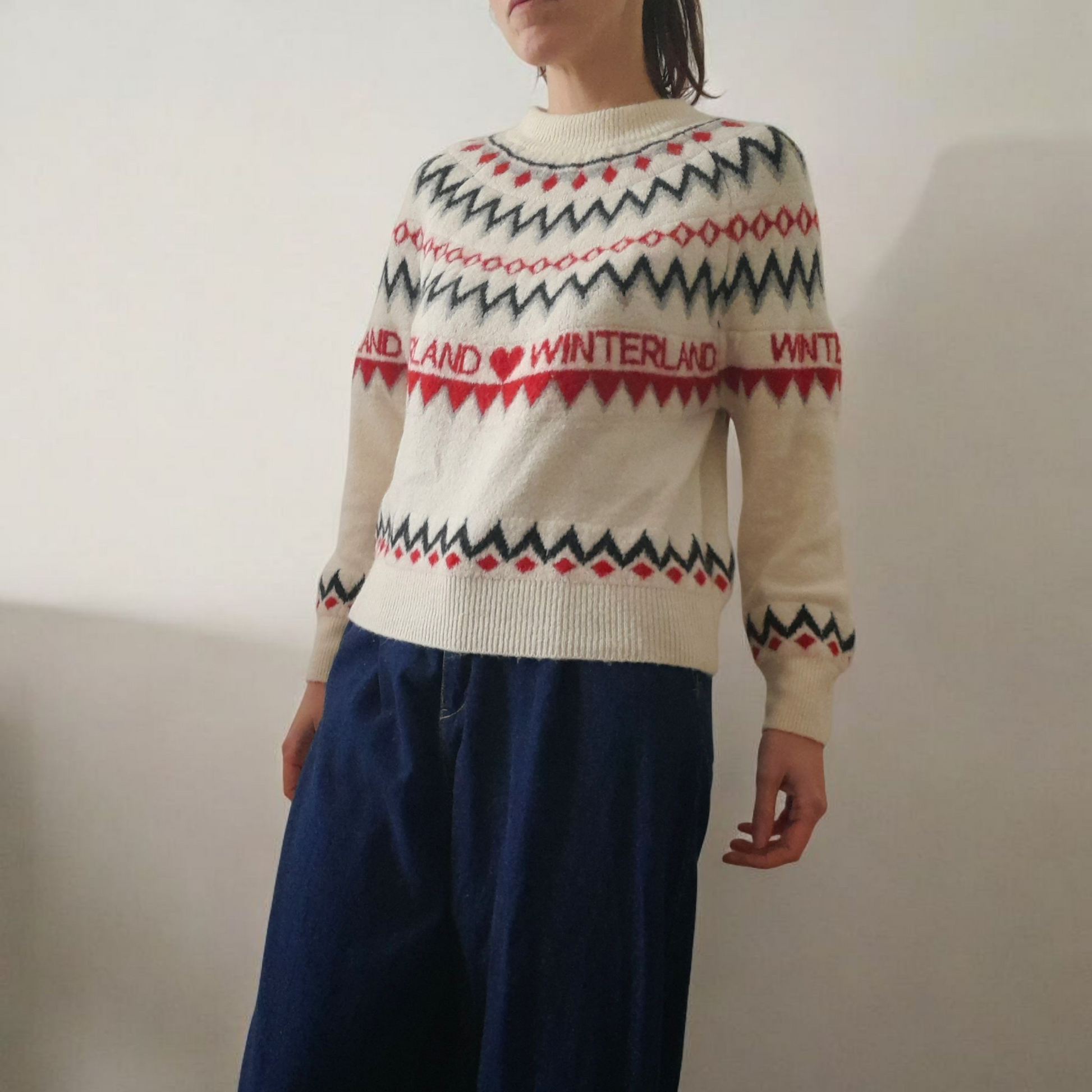Vintage Y2K H&M jumper. Knitted with wonderfully soft stretchy cream yarn with a zig zag diamond black, grey and red Fairisle pattern with Winterland text and cute red heart.